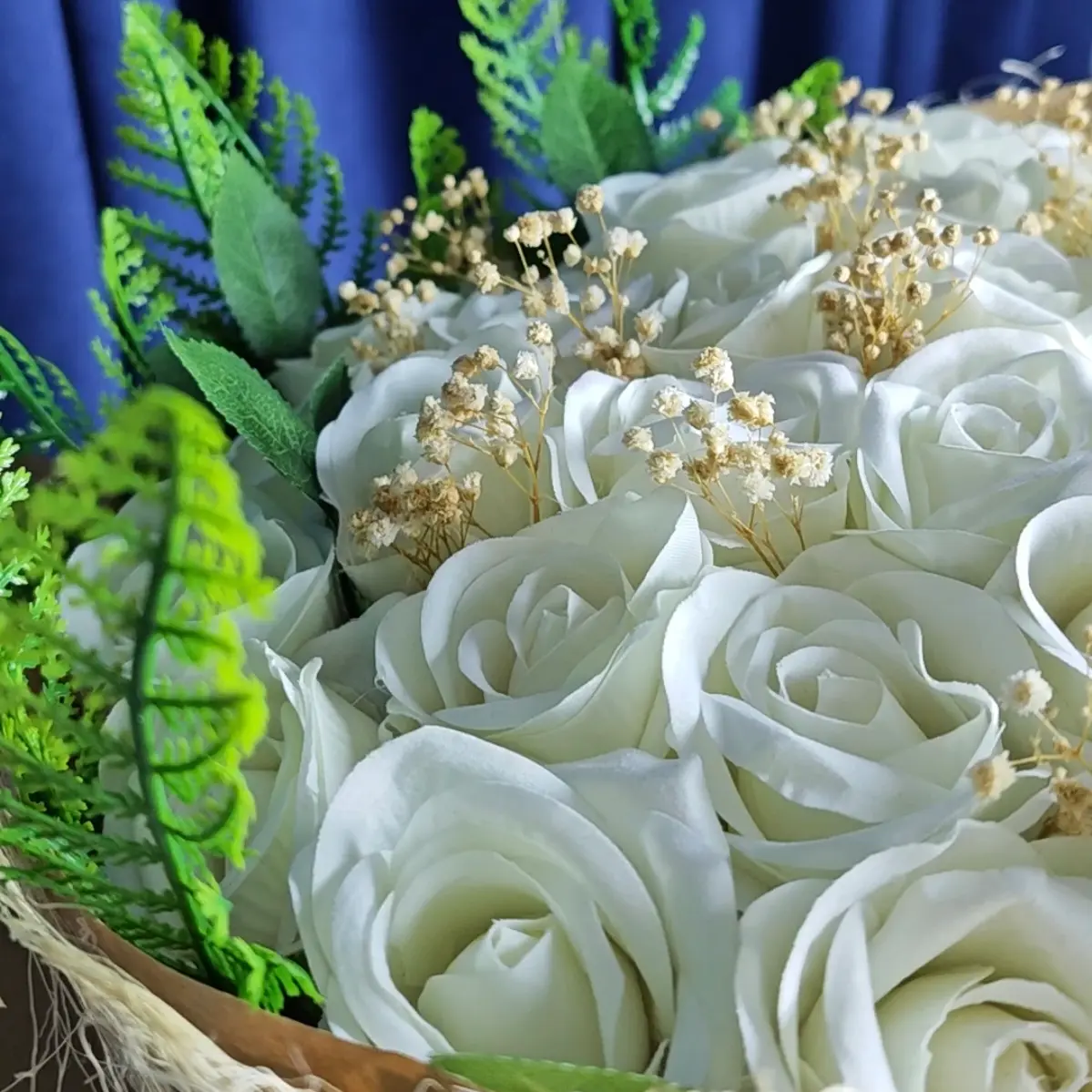 Bembeyaz güllerin jüt file zarafetiyle buluştuğu bu tasarım, sevdikleriniz için yıllarca saklanacak masum bir hatıradır. Siparişiniz üzerine sizin için özenle hazırlanır.