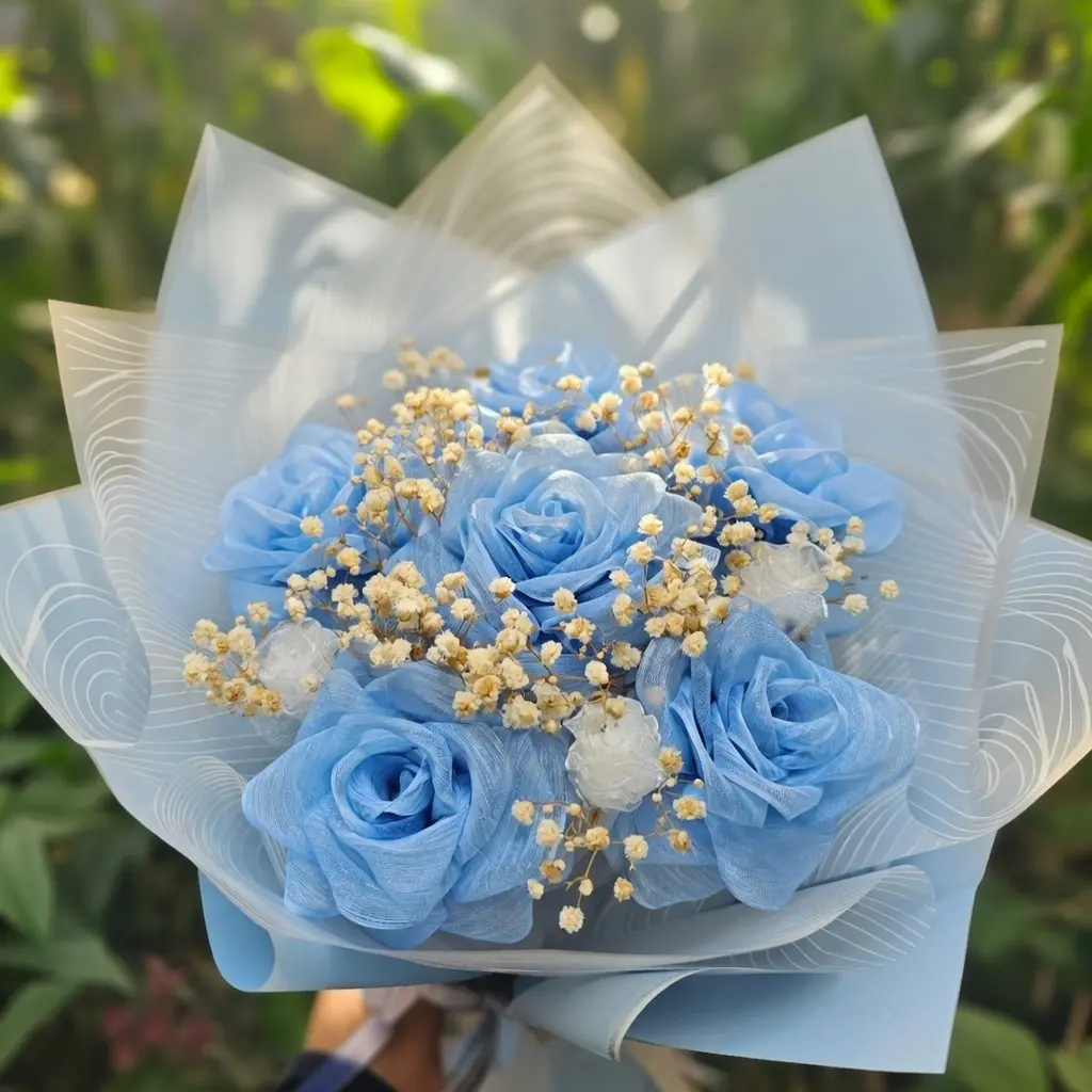 Kelimelerin duygularınızı anlatmaya yetmediği o özel anlarda, renklerin güçlü dilini kullanmayı denediniz mi? Mavi; sonsuz gökyüzünü, dingin denizleri ve en önemlisi sarsılmaz bir güveni temsil eder. Biz, Yıldız Buket atölyemizde tek tek elde şekil verdiğimiz mavi kurdele gül buketi ile sevdiklerinize sadece bir hediye değil, kucak dolusu huzur sunmanızı sağlıyoruz. Çünkü biliyoruz ki, el emeğiyle hazırladığımız bu güller, sıradan çiçeklerin aksine asla solmayacak ve sevdiklerinizin en güzel köşesinde yıllarca, ilk günkü zarafetiyle size gülümseyecek.